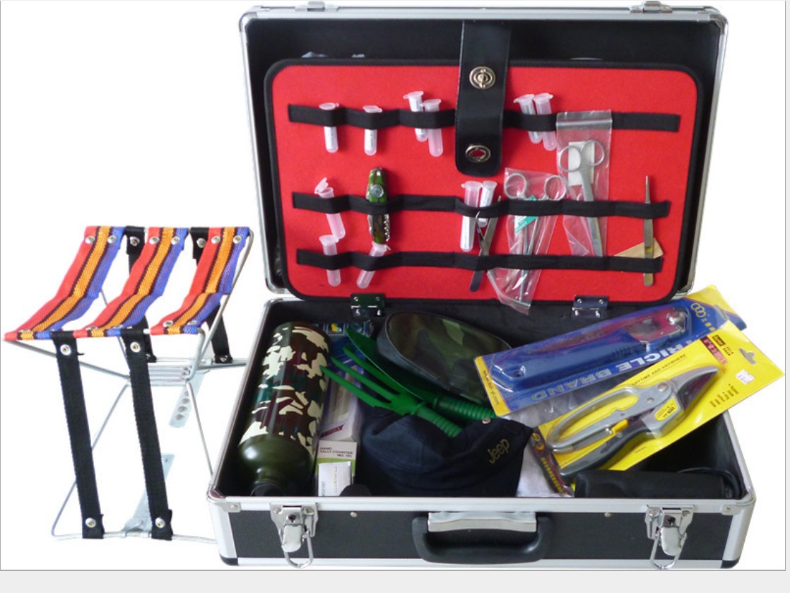 标本制作工具配置包括:标本制作便携工具包、昆虫针/标本针(1#-5#)、昆虫微针(1#-5#)、昆虫针台、可调展翅板、昆虫标本用三级台、展足板、昆虫软化剂、毒瓶内配试剂、标本制作胶、美工刀、尖嘴钳、枝剪、钢卷尺、充电手电、检疫手套、检疫口罩、衣服、解剖盘、三角纸袋、载玻片、盖玻片、袖珍秤、标本制作用注射针、带光源放大镜、指形管、棉签、广口瓶、毒瓶、采集袋(大中小规格)、塑料滴管、折叠水桶、植物标本名签、昆虫标本名签、昆虫标本记录本、植物标本记录本、签字笔、油性记号笔、书写夹、标本夹(木条式)、工具箱。